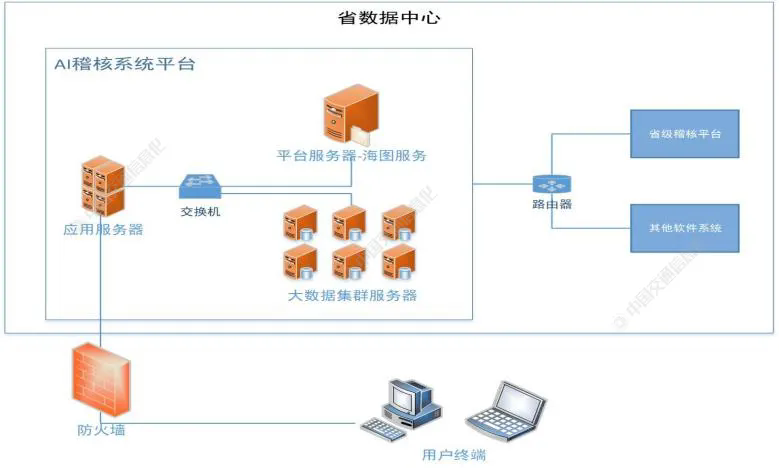 數(shù)據(jù)源是開展收費(fèi)稽核工作的基礎(chǔ),包括通行、交易、牌識(shí)、視頻等采集數(shù)據(jù)和車輛發(fā)行、路網(wǎng)、費(fèi)率、節(jié)點(diǎn)等基礎(chǔ)數(shù)據(jù),具體如下[8]。1、車道收費(fèi)數(shù)據(jù)具體包括車道收費(fèi)交易數(shù)據(jù)和車道牌識(shí)數(shù)據(jù),其中車道收費(fèi)交易數(shù)據(jù)包括出入口站點(diǎn)、出入口時(shí)間、車牌、車型、軸重、軸數(shù)、行駛里程、收費(fèi)金額等;車道收費(fèi)牌識(shí)數(shù)據(jù)包括收費(fèi)站編號(hào)、抓拍時(shí)間、識(shí)別車牌號(hào)、識(shí)別車型、抓拍圖片等。2、門架計(jì)費(fèi)數(shù)據(jù)和牌識(shí)數(shù)據(jù)具體包括門架計(jì)費(fèi)交易數(shù)據(jù)和門架牌識(shí)數(shù)據(jù),其中,門架計(jì)費(fèi)交易數(shù)據(jù)包括入口信息、交易時(shí)間、車型、車牌、計(jì)費(fèi)里程、計(jì)費(fèi)金額等;門架牌識(shí)數(shù)據(jù)包括門架編號(hào)、抓拍時(shí)間、識(shí)別車牌號(hào)、識(shí)別車型、拍攝位置、抓拍圖片等。3、發(fā)行數(shù)據(jù)包括ETC和OBU的發(fā)行數(shù)據(jù),具體包括發(fā)行省份、發(fā)行時(shí)間、車牌、車型、顏色、圖片、軸數(shù)以及辦理人的相關(guān)信息。4、跨省拆分?jǐn)?shù)據(jù)包括車輛跨省通行的車輛通行數(shù)據(jù)和收費(fèi)數(shù)據(jù),具體包括車輛通行收費(fèi)站出入口數(shù)據(jù)、車道交易數(shù)據(jù)、門架計(jì)費(fèi)數(shù)據(jù)等信息。5、全省治超數(shù)據(jù)和治超牌識(shí)數(shù)據(jù)主要包括車輛通行數(shù)據(jù)、計(jì)重?cái)?shù)據(jù)和牌識(shí)數(shù)據(jù),具體包括車輛通行時(shí)間、車牌、車型、軸重、軸型、圖片等數(shù)據(jù)。(二) AI稽核系統(tǒng)設(shè)計(jì)思路1、AI稽核網(wǎng)絡(luò)拓?fù)銩I稽核系統(tǒng)采用了大數(shù)據(jù)集群服務(wù)器、地圖引擎服務(wù)器、應(yīng)用服務(wù)器,網(wǎng)絡(luò)拓?fù)淙鐖D2所示。其中,大數(shù)據(jù)集群服務(wù)器主要對(duì)收費(fèi)數(shù)據(jù)、發(fā)行數(shù)據(jù)、拆分?jǐn)?shù)據(jù)、治超數(shù)據(jù)、牌識(shí)數(shù)據(jù)接收、存儲(chǔ)以及對(duì)稽核模型、路徑還原等進(jìn)行計(jì)算,還能通過倒排索引對(duì)數(shù)據(jù)進(jìn)行高性能檢索;地圖引擎服務(wù)器主要實(shí)現(xiàn)地圖圖層加載、路網(wǎng)模型計(jì)算;應(yīng)用服務(wù)器主要實(shí)現(xiàn)對(duì)AI稽核系統(tǒng)的部署和接口的數(shù)據(jù)交互。