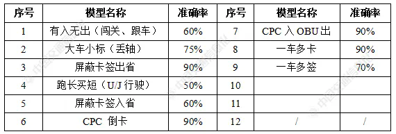 (四)稽核模型建立與準(zhǔn)確率驗(yàn)證本文所述AI稽核系統(tǒng)根據(jù)不同逃費(fèi)類型建立對(duì)應(yīng)模型,目前已實(shí)現(xiàn)大車小標(biāo)、有入無出、屏蔽卡簽入省、屏蔽卡簽出省、跑長買短、CPC倒卡、CPC入OBU出、一車多卡、一車多簽等近10種偷逃費(fèi)行為稽核。以大車小標(biāo)偷逃費(fèi)行為進(jìn)行舉例說明。改變車型(車種):大車小標(biāo)是指發(fā)行車型跟實(shí)際車型不符。通過非法手段辦理或套取使用與實(shí)際車型不符的車輛標(biāo)簽,達(dá)到偷逃費(fèi)的目的?;藬?shù)據(jù)驗(yàn)證方式如下:(1)通過交易數(shù)據(jù)中的車牌、車牌顏色和車型與發(fā)行數(shù)據(jù)對(duì)比,確定大車小標(biāo);(2)利用入口稱重?cái)?shù)據(jù),在收費(fèi)數(shù)據(jù)中的入口交易數(shù)據(jù)搜索軸數(shù)與車型不符的車輛;(3)搜索收費(fèi)數(shù)據(jù)中的入口交易數(shù)據(jù),車型為一型貨車,且車牌顏色為黃色的車輛;(4)篩選車輛通過ETC專道和人工車道的收費(fèi)車型存在不一致的情況,通過車牌號(hào)篩選某個(gè)車牌多次出現(xiàn)兩個(gè)及以上的車型的車輛;(5)對(duì)篩選出的車輛,根據(jù)大數(shù)據(jù)平臺(tái)圖片、交易數(shù)據(jù),對(duì)特征點(diǎn)進(jìn)行對(duì)比分析,形成初步結(jié)論。通過對(duì)稽核模型分析數(shù)據(jù)與稽核人員核實(shí)數(shù)據(jù)對(duì)比分析,進(jìn)行稽核模型分析篩查準(zhǔn)確率驗(yàn)證,稽核模型準(zhǔn)確率如表2所示。屏蔽卡簽、倒卡通行介質(zhì)等稽核模型準(zhǔn)確率較高,達(dá)90%,有入無出(闖關(guān)、跟車)、跑長買短(U/J行駛)因系統(tǒng)及計(jì)費(fèi)規(guī)則、現(xiàn)場(chǎng)管理和證據(jù)獲取等多重因素影響,準(zhǔn)確率為50%~60%左右,但能夠滿足稽核業(yè)務(wù)需求?;四P蜏?zhǔn)確率如表2所示。